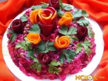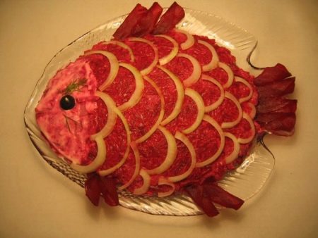 Ramai salad kelihatan agak menarik dan tidak memerlukan hiasan tambahan. Walau bagaimanapun, anda sentiasa boleh menggunakan beberapa helah reka bentuk asal dan menukar hidangan biasa yang di luar pengiktirafan. Sebagai contoh, salad herring yang biasa untuk semua orang di bawah kot bulu boleh dibentangkan dalam bentuk ikan atau dihiasi dengan mawar wortel.