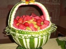 Semangka boleh berfungsi sebagai bakul untuk salad buah atau hidangan manis lainnya. Pertama anda perlu menggariskan pemegang bakul pada kulit beri. Kemudian bahagian-bahagian yang tidak diperlukan dipotong daripada semangka dan pulpa dibuang.
