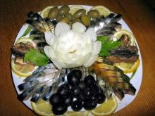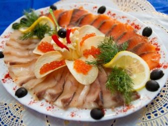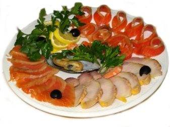 Ikan pelbagai dilengkapi dengan produk lain: kaviar merah, udang, kerang, sayuran atau lemon.