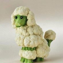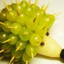 Dari sayur-sayuran dan buah-buahan, anda boleh mencipta tokoh haiwan yang menakjubkan atau watak kartun. Jika anggur hijau disematkan pada dasar pir dengan tusuk gigi, dan anggur hitam diletakkan pada pinggir yang sempit, anda akan mendapat landak kecil. Mata burung landak boleh dibentuk dari kepingan kecil anggur hitam. Anda boleh membuat poodle keluar dari kembang kol.