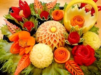 Dalam memasak, terdapat arah yang berasingan dalam pemotongan seni buah-buahan dan sayur-sayuran - ukiran. Bouquets keseluruhan untuk hiasan meja boleh dibentuk daripada produk yang dipotong mengikut teknologi tertentu. Untuk memotong unsur kompleks, pisau tajam dengan saiz bilah yang berbeza akan diperlukan.
