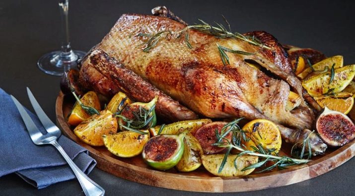 - Plat dengan angsa yang dipanggang boleh dihiasi dengan sayur-sayuran (salad, pasli) dan irisan lemon. Burung asli akan kelihatan dihiasi dengan buah atau buah-buahan: anggur, cranberi, epal, kiwi, oren atau strawberi.