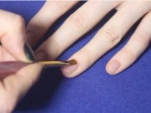 - Seterusnya, anda memerlukan batang oren dengan hujung serong, yang digunakan untuk menggerakkan kutikula. Dia perlu berhati-hati mengeluarkan kelop gel yang lembut di antara rambut. Kerja ini agak teliti dan lambat.