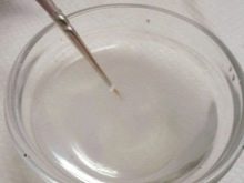 - Ambil sebuah bekas kaca rata kecil. Tuang di dalamnya sedikit cara untuk membasuh longgokan yang telah anda pilih.