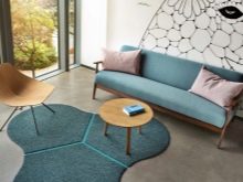 - Coatings terletak berhampiran sofa dan kerusi berlengan tanpa di bawah mereka. Jarak antara pinggir permaidani dan perabot harus memungkinkan orang duduk di permaidani dengan bebas. Di bahagian tengah penutup boleh diletakkan meja untuk majalah.