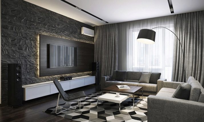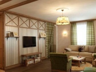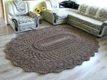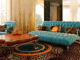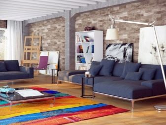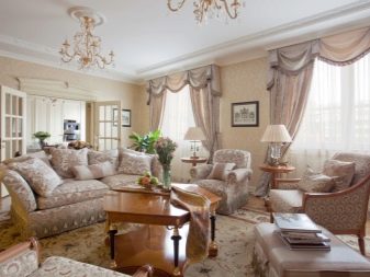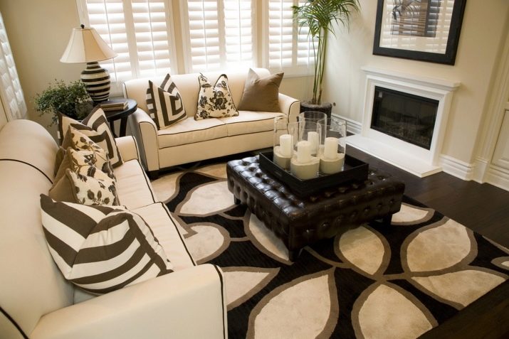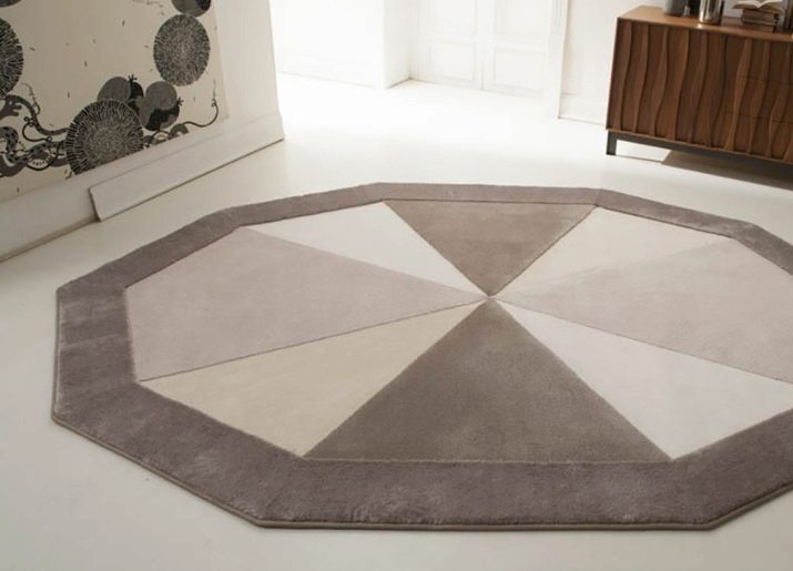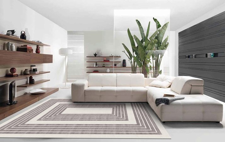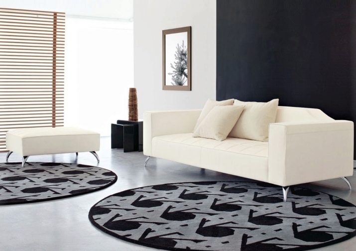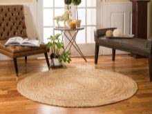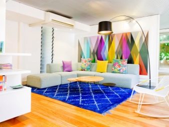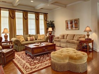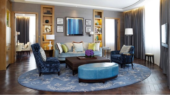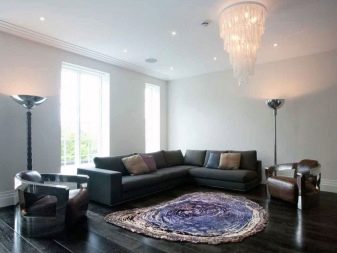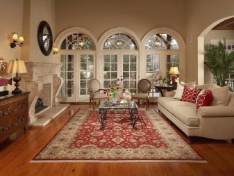 Sekiranya dewan didominasi oleh kontur lurus, maka lebih logik untuk menyebarkan salutan bulat di lantai untuk menyesuaikan sudut. Pada masa yang sama, beberapa jenis tambahan yang serupa - bantal untuk sofa, pasu atau hiasan dinding sering ditambah ke dewan.