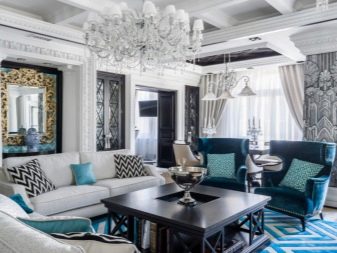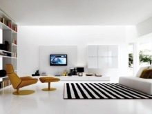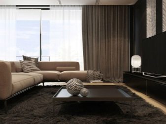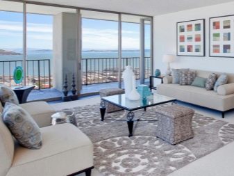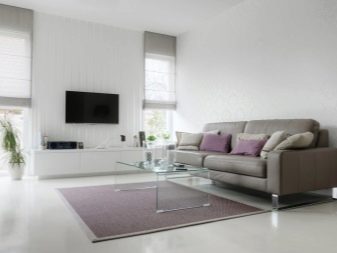 Pelapisan besar terlalu menekankan diri, oleh itu Salutan monochromatic digunakan dalam bahagian dalaman terang. Apabila terdapat perabot kecil di ruang tamu dengan kaki tinggi, permaidani saiz yang cukup sesuai dengan sempurna.