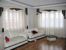Pendekatan reka bentuk moden membolehkan anda mengubah kecacatan reka bentuk ke dalam kelebihan komposisi dalaman. Sebagai contoh, jika tingkap di ruang tamu kecil dan hodoh, anda tidak perlu menekankan saiznya dengan langsir tebal dan tebal. Sekiranya boleh, tambah saiznya. Apabila ini tidak mungkin, ia dihiasi dengan tulle putih lut, yang menambah keanggunan pada reka bentuk dan membuat tingkap tidak begitu hodoh terhadap latar belakang dinding.