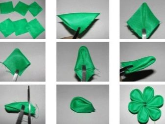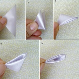 Paling kerap, kraf reben lipat, mereka berpaling kepada unsur-unsur bunga - kelopak, daun, tunas. Pemula harus menguasai hanya dua teknik untuk melaksanakan produk tersebut: dengan kelopak bulat dan tajam. Untuk membuatnya, anda memerlukan skema yang paling mudah, pita yang lebih nipis dan padat 5 cm lebar.