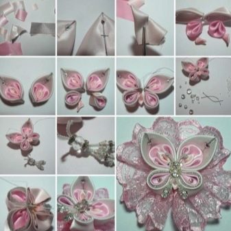 - Kami tarik pita renda dari satu tepi membujur, mendapat bunga terbuka yang indah, di mana kami memasang kupu-kupu kami. Warna renda sepadan dengan sisipan sayap gelap.