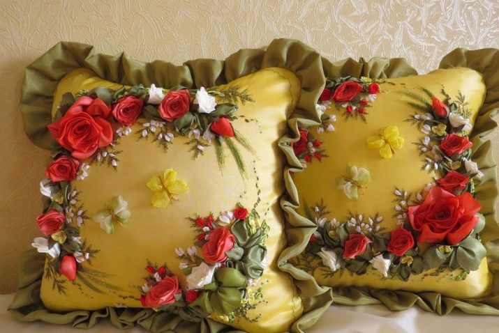 - bantal hiasan satin kuning bersulam dengan bunga pita;