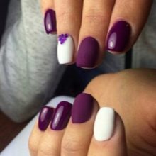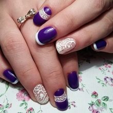 Warna yang paling berjaya dan menang-menang yang menghasilkan tandem sempurna dengan ungu adalah putih. Dengan bantuannya, anda boleh menutup seluruh kuku individu, dan membuat pelbagai corak. Terutama kelihatan renda putih pada naungan warna ungu pucat.