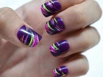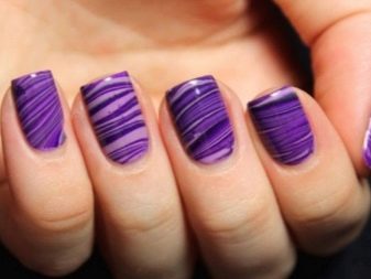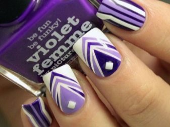 - Anda perlu memberi perhatian kepada manicure ungu cahaya dengan jalur. Mereka boleh terpaku atau ditarik dengan tangan.