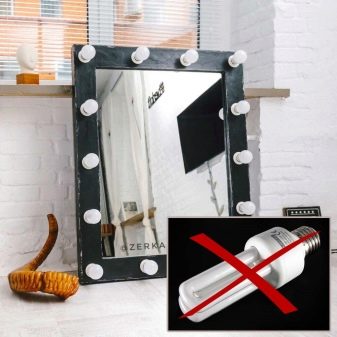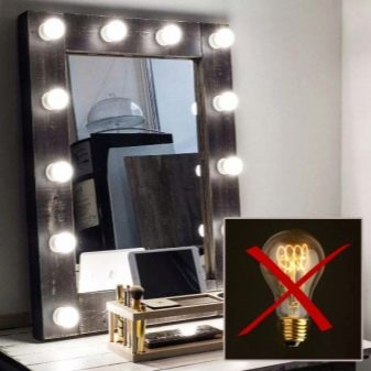 Lampu pijar, yang popular pada masa lalu, kini praktikalnya tidak digunakan untuk pembuatan cermin solekan. Walaupun spektrum mereka sesuai untuk solek berkualiti tinggi, mereka mengeluarkan banyak haba, jadi jika anda duduk di hadapan cermin dengan lampu pijar untuk masa yang lama, muka anda akan berpeluh dan solek akan terapung.