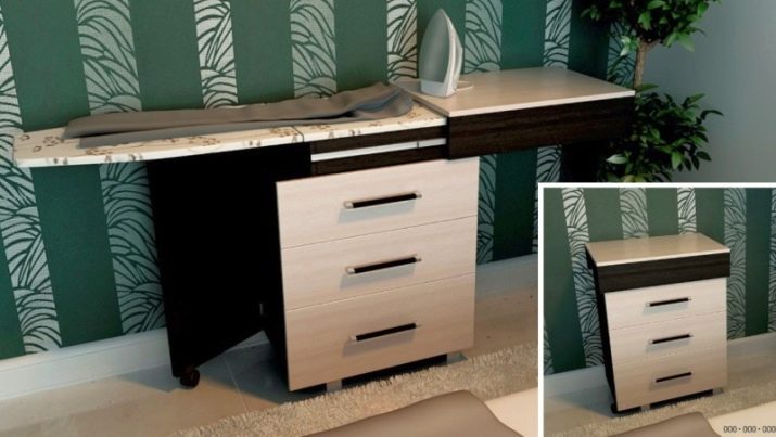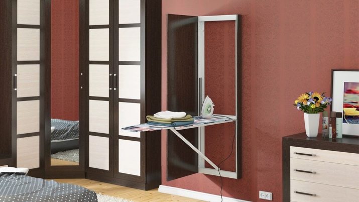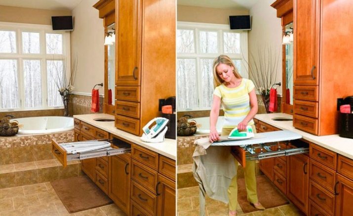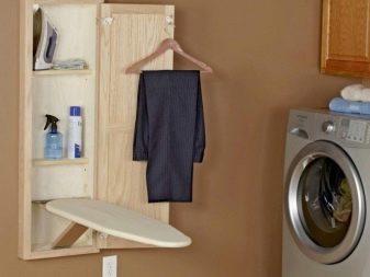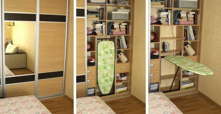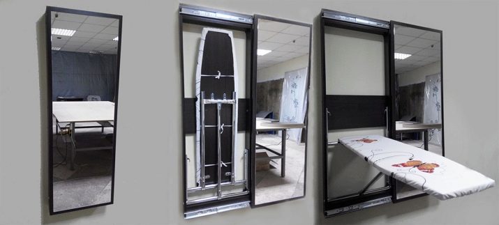 Panel penyeteru yang dibina ke dalam kabinet boleh sama ada ditarik balik atau dilipat. Ia semua bergantung kepada kedalaman dan ketinggian kabinet. Walau bagaimanapun, penyokong tidak akan menghalang anda daripada menggunakan kabinet untuk tujuannya - untuk menyimpan barang-barang di dalamnya.