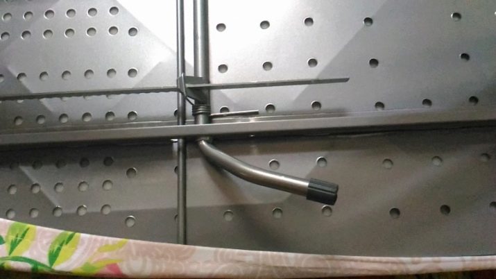 Rak untuk perkara terletak di bahagian bawah panel penyeterikaan. Jika perlu, rak boleh dilipat. Atribut ini sangat mudah: ia membolehkan anda menjimatkan ruang di permukaan kerja tanpa memuatkannya dengan perkara-perkara yang tidak perlu.