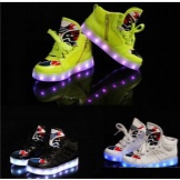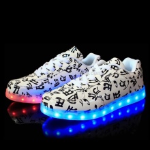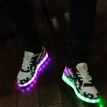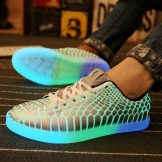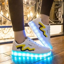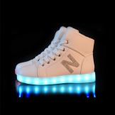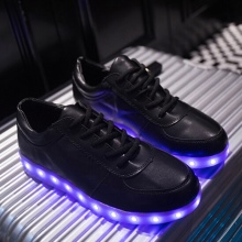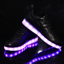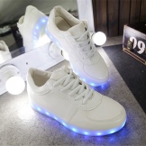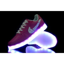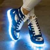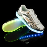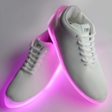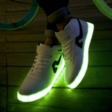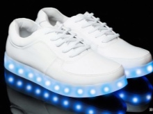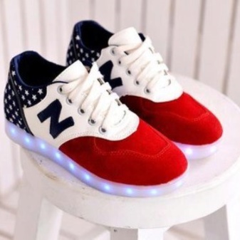 - Led ked mempunyai satu-satunya yang diperbuat daripada getah berkualiti tinggi. Di dalamnya terdapat LED, bateri dan kabel USB. Di bahagian atas, berhampiran tali, di antara lapisan bahan ada butang untuk mengaktifkan dan mengawal lampu latar. Pengguna dijemput untuk 8 mode pencahayaan dan 7 warna. Sneakers boleh bersinar hingga 10 jam dengan bayaran tunggal.