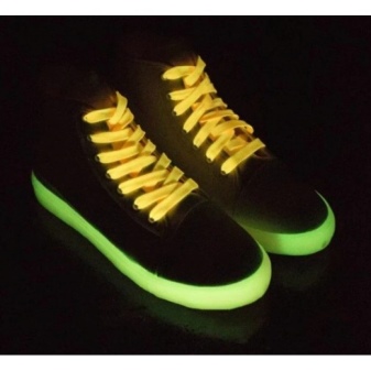 Di dalam tunggal adalah bateri kecil dan jalur LED. Semua wayar, kenalan dan unsur cahaya boleh dilindungi dari kerosakan dan kelembapan luaran. Kasut dengan kasut yang bercahaya mesti dikenakan. Di belakang lidah adalah kabel USB yang boleh disambungkan ke komputer riba, komputer atau pengecas.