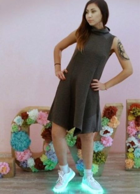 Fakta bahawa pakaian dapat dengan mudah digabungkan dengan sepatu kets tidak mengejutkan siapa pun, sebaliknya, trend yang sama digunakan secara aktif oleh para fesyen. Sneakers dengan LED backlighting tidak terkecuali, sebaliknya, mereka harmoni bergabung menjadi satu imej, bukan hanya dengan gaun, tetapi juga dengan banyak pakaian klasik. Dalam imej ini, pakaian abu-abu longgar memotong mudah dan kasut dengan lampu belakang LED digunakan. Kedua-dua unsur ini saling melengkapi antara satu sama lain, kasut terang membuat pakaian itu lebih menarik, sebaliknya, gaya kasut ringkasnya kasut yang menarik.