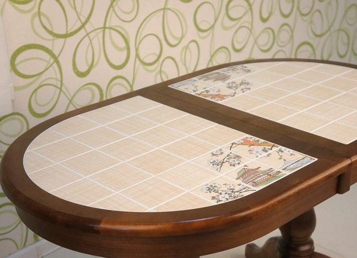 - Bahagian atas meja makan, yang terdiri daripada jubin seramikAdakah penyelesaian yang sangat baik. Ia akan menggantikan batu dan marmar sepenuhnya. Corak asal akan mewujudkan suasana yang tidak dapat dijelaskan yang akan hadir di ruang makan.