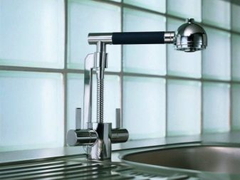- Reka bentuk yang bergaya. Keran yang baru diperoleh tidak boleh merosakkan bahagian dalaman yang ada di dapur dengan penampilan asalnya. Sebaik-baiknya, peranti itu sepatutnya sesuai dengan reka bentuk sink dan dapur. Oleh itu, anda perlu mencari kren yang dibuat dari bahan yang sama dan dalam penampilan sesuai untuk alam sekitar.