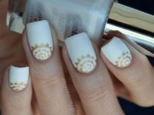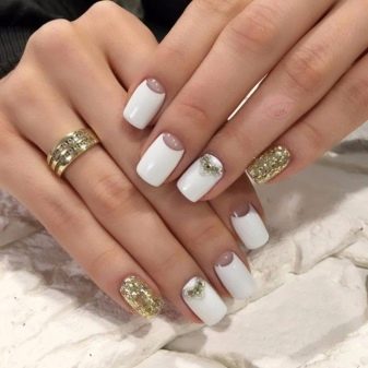 Untuk membuat penampilan elegan dan perayaan, para tuan menasihati untuk melengkapkan manicure putih dengan berkilau dan rhinestones. Penggunaannya dengan kombinasi warna neutral emas, hiasan kuku hitam dan biru sangat relevan.