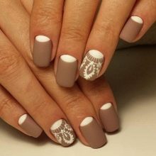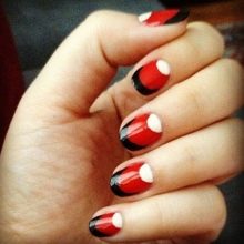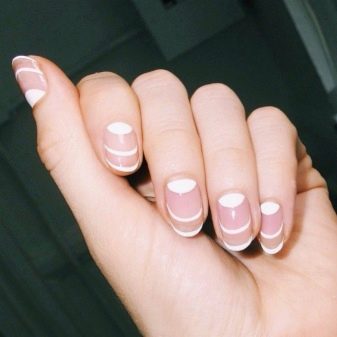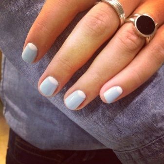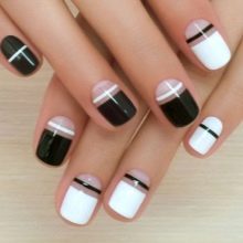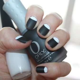 Manicure seperti ini boleh dilakukan dengan varnis berkilat atau matte. Ia juga mungkin untuk melengkapkan reka bentuk dalam bentuk lukisan kecil pada satu, beberapa atau semua jari. Ia boleh menjadi arka warna gelap atau sejenis angka geometri yang dibuat dengan berus nipis.