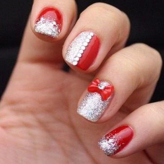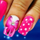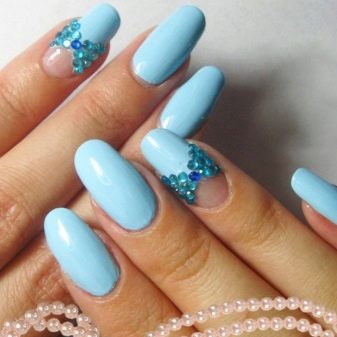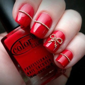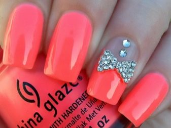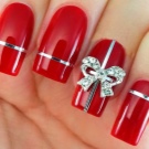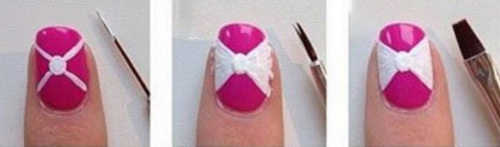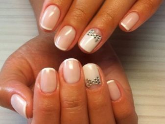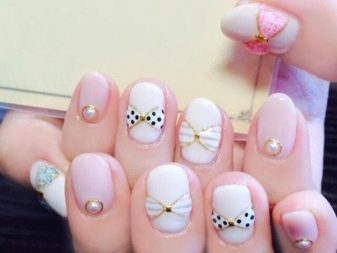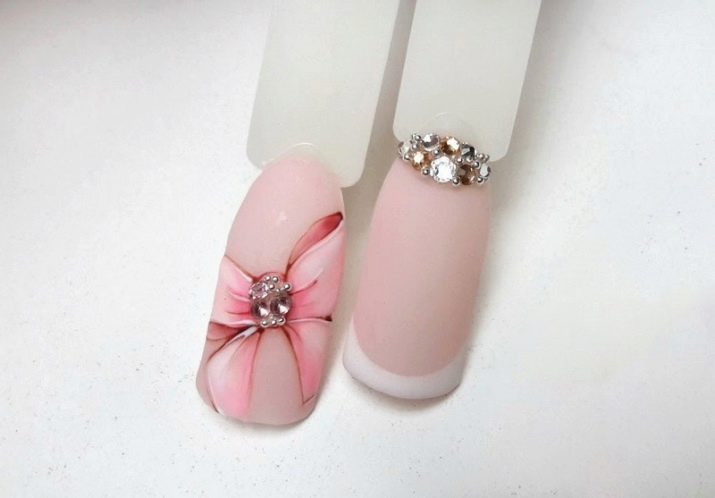 Satu lagi pilihan untuk mencipta manicure yang indah dengan unsur-unsur busur adalah penggunaan rhinestones dan broths. Adalah lebih baik untuk melakukannya pada salutan gel varnish, kerana pada kuku biasa, hayat perkhidmatan teknik ini akan lebih pendek.