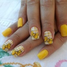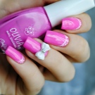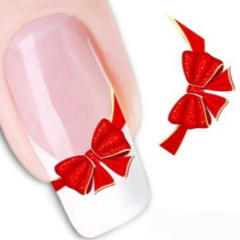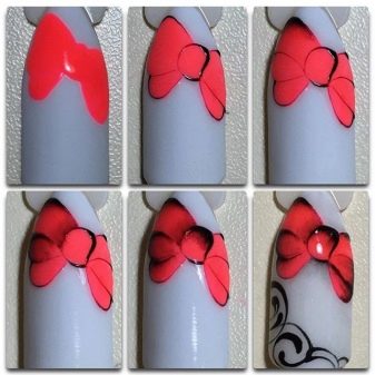 Mana-mana tuan pemula dengan pendekatan yang betul dapat membuat busur sangat mudah. Pertama sekali, adalah perlu untuk menyediakan kuku itu sendiri, kemudian tutupnya dengan warna yang dipilih untuk reka bentuk kuku. Anda perlu melekatkan pelekat di atas. Kemudian kot dengan asas penetasan (varnish tanpa warna).