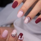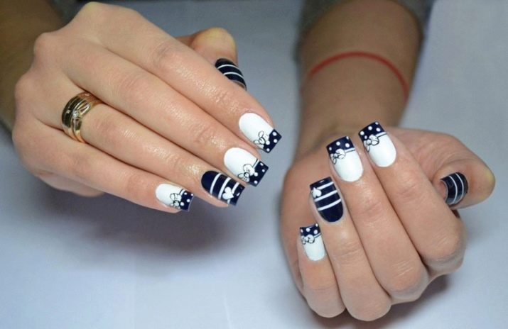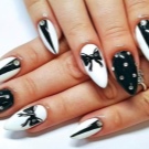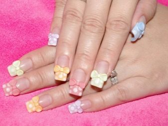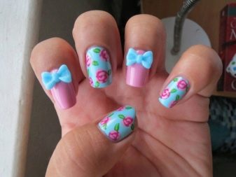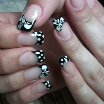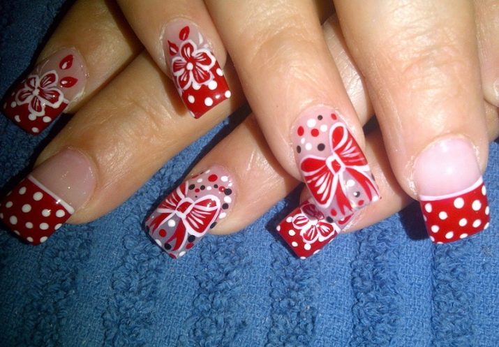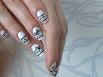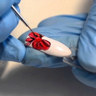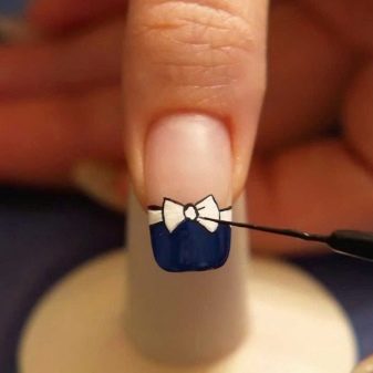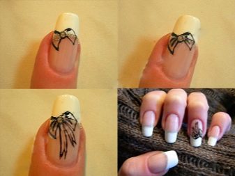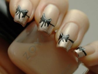 Adalah dibenarkan untuk menjalankan reka bentuk ini dengan cara yang berbeza: jelas, subur, dengan lukisan butiran kecil. Sangat penting untuk memilih nada yang betul, melengkapkan corak dengan garis, kacang, keriting. Sudah tentu, dalam kes yang kedua, adalah lebih baik jika seorang profesional melakukan teknik ini lagi. Busur terlihat bermanfaat pada reka bentuk lain, serta pada kuku yang diperluas.