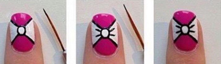 Selepas itu, anda perlu mula membuat lukisan. Kami melukis garis, mengisi lompang dengan warna yang dipilih. Adalah lebih baik untuk menggambar garis-garis dalam beberapa peringkat: mula-mula nipis, kemudian lukis lagi. Di dalam busur boleh diisi dengan titik-titik atau dibuat dalam satu warna. Untuk mengubah imej gambar, anda boleh menambah berkilau atau rhinestones.