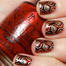 Reka bentuk Oriental sentiasa kelihatan mewah. Reka bentuk kuku yang indah ini sangat sesuai untuk pencinta seni kuku yang spektakuler. Warna-warna dalam manicure seperti ini biasanya gelap dan tepu. Di samping itu, ia juga dihiasi dengan manik-manik dan rhinestones yang terang, kadang kala perhiasan sebenar digunakan.