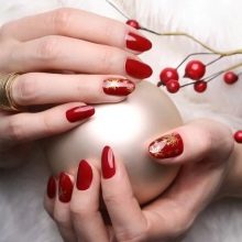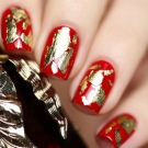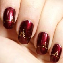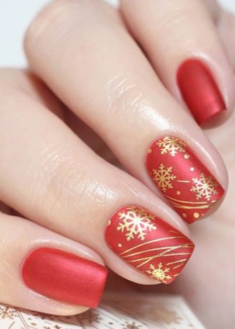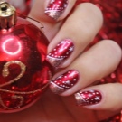 Biasanya asasnya ditutup dengan merah, warna perayaan tradisional, dan di atasnya digunakan corak, corak dan dekorasi yang lain. Selalunya, pokok-pokok Krismas, salji salji, bintang-bintang atau garland ditarik. Contohnya, anda boleh cat kuku anda dengan warna merah yang hangat, kemudian lukiskan pokok Krismas simbolik pada sepasang pinggan, dan meregangkan glitter pada yang lain. Atau, pada kuku merah, berusaha untuk ceri, lukiskan kepingan salji emas yang cantik dan corak lain. Untuk Tahun Baru Cina, adalah idea yang baik untuk menutup kuku anda dengan merah dan menarik siluet naga atau bunga yang indah di atasnya dengan emas.