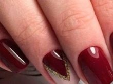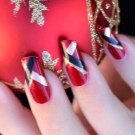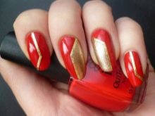 Pertama, kuku dan kutikula disediakan dengan betul, maka kuku dicat dua kali dalam warna merah cerah. Apabila mereka kering, dengan pita pelekat anda perlu membuat beberapa segi tiga di atas pinggan, cat dengan emas dan segera keluarkan ejen bantu.Apabila varnis kering, segala-galanya perlu diperbetulkan dengan selesai telus.