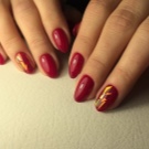 Sebaiknya, plat kuku perlu bulat, bujur atau segi empat tepat. Kuku tajam harus dielakkan, kerana jika anda cat mereka merah, kesannya mungkin terlalu provokatif. Lebih baik menggunakan shellac, yang dicirikan oleh ketahanan, warna tepu dan aplikasi seragam. Selain itu, shellac hanya digunakan untuk asas merah, dan untuk pola emas ia sudah dibenarkan menggunakan varnis biasa. Kelebihan khas penggunaan dwi ini adalah keupayaan untuk menyesuaikan elemen hiasan tanpa menjejaskan pangkalan.