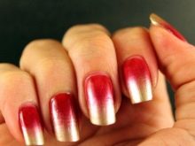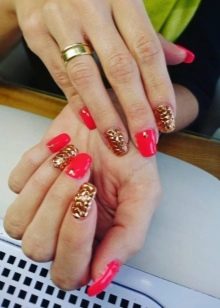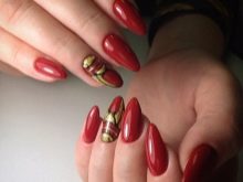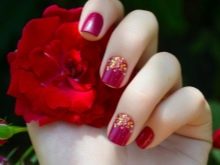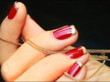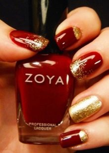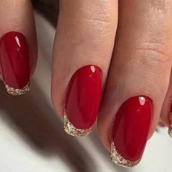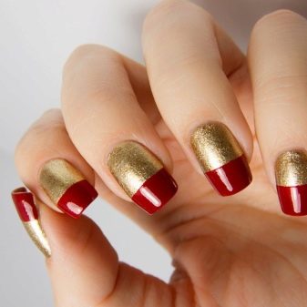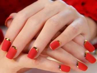 Walaupun kekasih pastel Perancis dan warna telanjang kadang-kadang merasakan keinginan untuk membuat cerah, harfiah berteriak, tetapi tidak manicure kasar. Untuk kes ini, gabungan warna merah dan emas adalah yang terbaik. Merah itu sendiri dianggap sebagai teduhan klasik, yang akan sesuai di pejabat dan di majlis perkahwinan. Emas dalam keadaan ini hanya melembutkan pasangannya sedikit dan menambah dia bersinar yang diperlukan.
