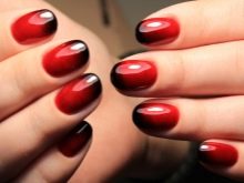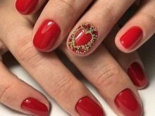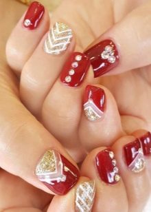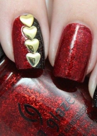 Cukup penyelesaian bukan standard, tetapi sangat cantik akan penambahan elemen hiasan selesai yang besar. Sebagai contoh, sebahagian kuku ditutup dengan varnis merah dan emas tulen, dan sepasang plat membentuk gambar tiga warna: kuku dibahagi secara menegak, separuh dicat hitam, separuh berwarna merah, dan sempadan terbentuk daripada hati palsu emas.