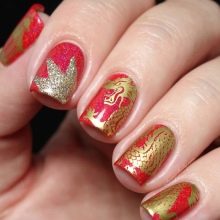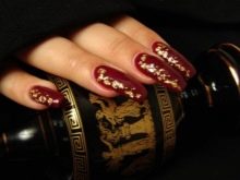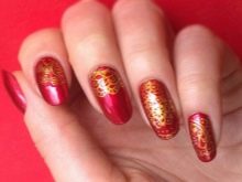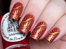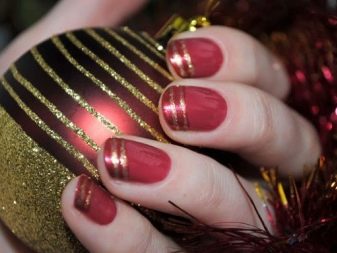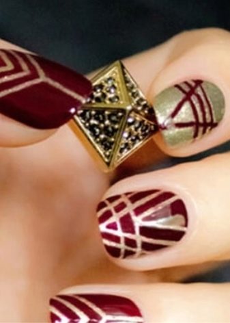 Adalah disyorkan untuk menutup dua kuku dengan lukisan.kerana varnis sendiri sangat terang dan redundansi mungkin berlaku. Walaupun asas merah dan corak emas biasanya dipilih, sebaliknya juga mungkin. Sebagai peraturan, penekanan dalam manicure seperti ini adalah pada jari cincin, yang boleh dibezakan bukan sahaja dengan corak yang indah, tetapi juga dengan hiasan emas, jubin atau bahkan skala. Dalam kes yang kedua, jari-jari yang tinggal harus tetap dicat dengan gloss yang kemas. Sekiranya dasar dicat dengan warna merah, corak yang paling popular dipanggil garis lurus atau pecah, segi tiga dan segi empat.
