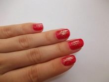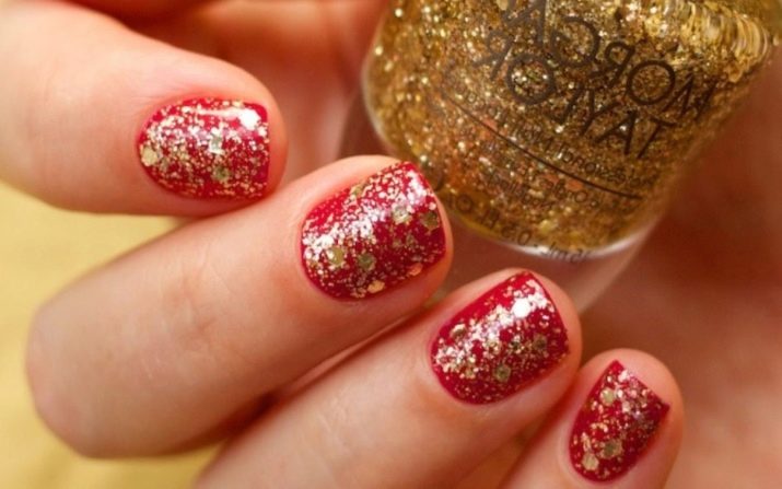 Satu lagi penyelesaian mudah untuk kegunaan rumah adalah perhiasannya. Pada peringkat pertama, kuku juga ditutup dengan dua lapisan merah. Seterusnya, satu lapisan varnis telus digunakan untuk paku, dan kemudiannya spangles dibentangkan.
