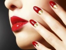Baru-baru ini, manicure bulan, yang dikenali sebagai jaket terbalik, telah menjadi sangat popular. Asas itu dicat di mana-mana warna merah, dan lunula berbentuk sabit ditutupi dengan emas yang sesuai.