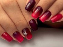Popular adalah hiasan "regangan". Untuk melakukan ini, seluruh kuku ditutup dengan varnis merah, maka spangles banyak digunakan pada hujungnya dan jumlahnya secara beransur-ansur berkurangan ke arah lunula.