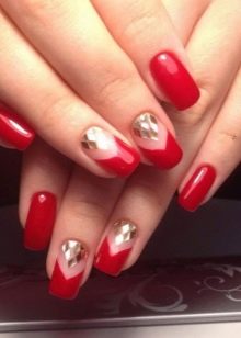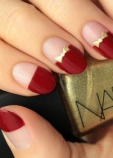By the way, jaket boleh berwarna, dan chevron, dan Perancis dengan busur. Dalam kes yang kedua, kuku hampir separuh, bahagian belakang dicat dengan warna merah, bahagian yang terdekat berwarna pink atau putih pucat, dan busur emas ditarik di sempadan. Kita tidak boleh melupakan ruang negatif, yang dicirikan oleh jurang antara varnis merah dan emas.