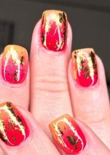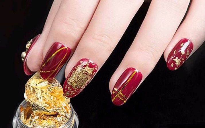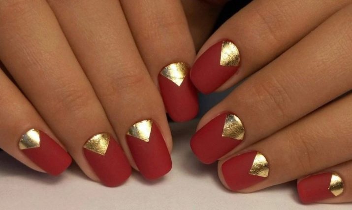 Kita tidak boleh melupakan reka bentuk kuku merah dengan kerajang emas, yang dianggap penyelesaian yang sangat bergaya.