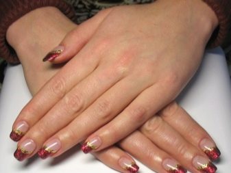 Di samping itu, terdapat banyak variasi manicure, kerana struktur berlainan lapisan emas. Manikur boleh dilakukan dengan jalur licin walaupun, atau mencipta kesan pasir bergelora, menutup kuku dengan skala timbul, atau kerajang yang licin. Kesan mika adalah popular hari ini, tetapi anda boleh mengehadkan diri untuk lukisan seragam. Manicure merah emas boleh berkilau dengan cerah atau tidak menggembirakan dengan pergerakan jari-jari wanita.