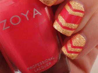Variasi varnis emas memungkinkan untuk memeluk kuku dengan berkilau berkilau besar atau kecil. Di samping itu, reka bentuk akan berubah dengan ketara jika glitter digunakan pada bahagian yang berlainan pada plat kuku.