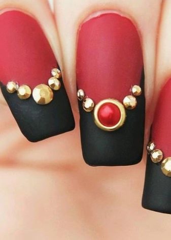 Dalam reka bentuk yang lain, semua kuku dibuat sama: pembahagian plat berlaku secara mendatar. Petua dicat matte hitam, dan bahagian kuku yang terdekat adalah matte merah. Perbatasan di antara mereka disusun dengan pasta emas, dan di salah satu kuku batu kerikil tengah dapat diganti dengan merah.