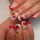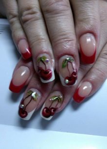 Tiruan manicure Perancis dengan ceri kelihatan mewah. Reka bentuk ini boleh dilakukan pada semua kuku, dan secara eksklusif pada jari tengah dan cincin. Untuk menciptanya, anda harus mengikuti langkah berikut: