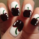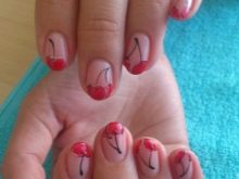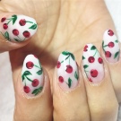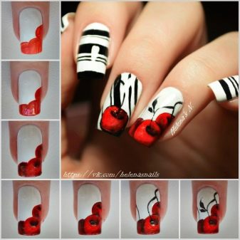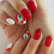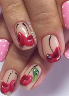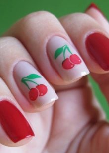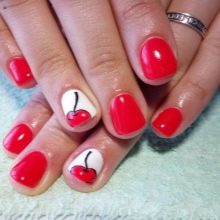 Ini hanyalah idea asas manicure dengan ceri. Anda boleh menggunakannya menggunakan kuas khas untuk lukisan dan titik.