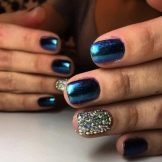 Manicure biru dengan emas adalah pilihan berani yang memerlukan pelaksanaan yang sempurna. Perlu dipertimbangkan bahawa biru memberikan semua keretakan dan kecacatan, jadi berhati-hati dalam mengendalikan kuku, dan mempercayai pelaksanaan manicure hanya kepada seorang profesional yang menggunakan bahan berkualiti tinggi.