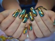 - Kerajang memberikan imej cermin "kaya". Sekarang manicure seperti ini sangat popular dengan bintang di luar negara.